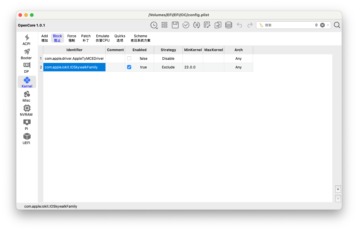 SIP yi devre dışı bırakın. OCLP kullanacaksınız o yüzden AMFIPass ın işli olması lazım. Bunun yanında da dikkat etmeniz gereken bir diğer husus kernel dan IOSkywalkFamily kextini Block kısmına eklemeniz gerekiyor. Fark ettiyseniz şu an yaptığımız işlemler BCM kartları OCLP de etkinleştirmek için yapılan işlemler.
