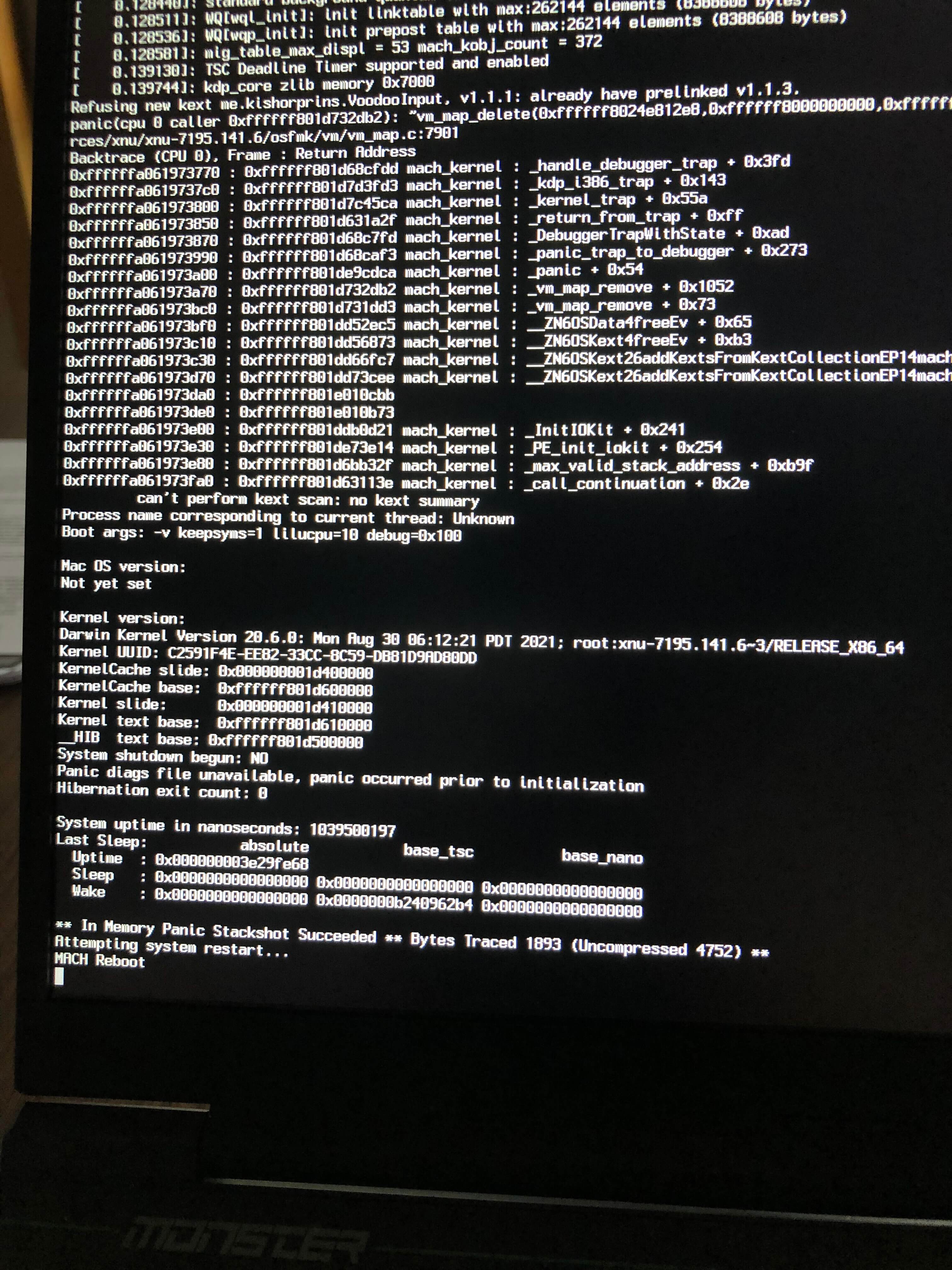 Yine yeniden merhaba. Big Sur'da şu an bataryamı tanıtmak için uğraşıyorum, ancak bir türlü olmuyor. SMCBatteryManager kext'i EFI/OC/Kexts'de mevcut ve Config'de aktif, ancak batarya yok. Bunu manuel DSDT yaması yapmadan çözmek için ECEnabler kextini atıp aktifleştirdiğimde ise reboot edemiyorum. NVRAM resetleyip girmeye çalışıyorum ancak ss'lerde görebileceğiniz Kernel Panic ile karşılaşıyorum. Bataryayı tanıtamıyor olmam trackpad ve klavye sorunlarına da yol açıyor (trackpadde tap to click yok, normal tıklama uzun tıklama olarak algılanıyor, dahili laptop klavyesi boottan sonra sleep yapıp kendi kendine geri açılmasını beklemediğim sürece çalışmıyor [sleep-wake sorunlarını bataryadan sonra düzelteceğim]). Bataryayı tanıtma konusunda yardımcı olabilirseniz sonunda Hackintosh kurulumum bitmiş olacak galiba