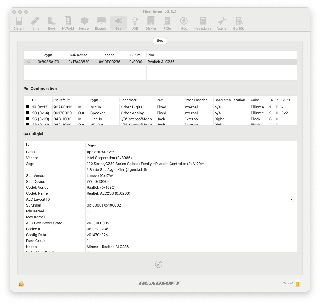 merhaba windows+big sur kullanıyorum ,windows aygıt yöneticisinden baktığımda 2 adet ses denetleyicisi görüyorum fotoğrafta gözüktüğü gibi,windowsa ek olarak realtek driver kuruyorum ses normal seviyesine geliyor yani driverdan önceki ses ile big surdaki ses aynı, bu olayı big sur üzerinde nasıl yapabilirim iki sistemde çıkan ses seviyesi şuanda farklı aynı olmasını istiyorum config dosyam ektedir. sadece alcid=3 komutunu kullanarak ses çıkışı sağlanmakta.