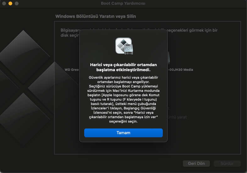 merhaba boot camp ile win kurmak istiyorum ancak Harici veya çıkarılabilir ortamdan başlatma etkinleştirilmedi. diye bir hata veriyor