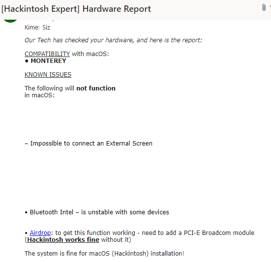 Hal böyle olunca ben de sorun sistemde mi diye kontrol etmek istedim. hackintosh experts diye bir siteden ücretsiz olarak donanımımı check ettirdim. Donanım listemi ekte paylaşacağım. Siteden bana yapılan geri dönüşte bilgisayarıma neredeyse sorunsuz bir şekilde Monterey Kuruyor olabilmem lazım ama bir türlü olmuyor. Stabilitesini geçtim en azından kurulum yapabilmek istiyorum.. Yardımcı olabilecek, fikir verebilecek kişiler var mı aranızda?