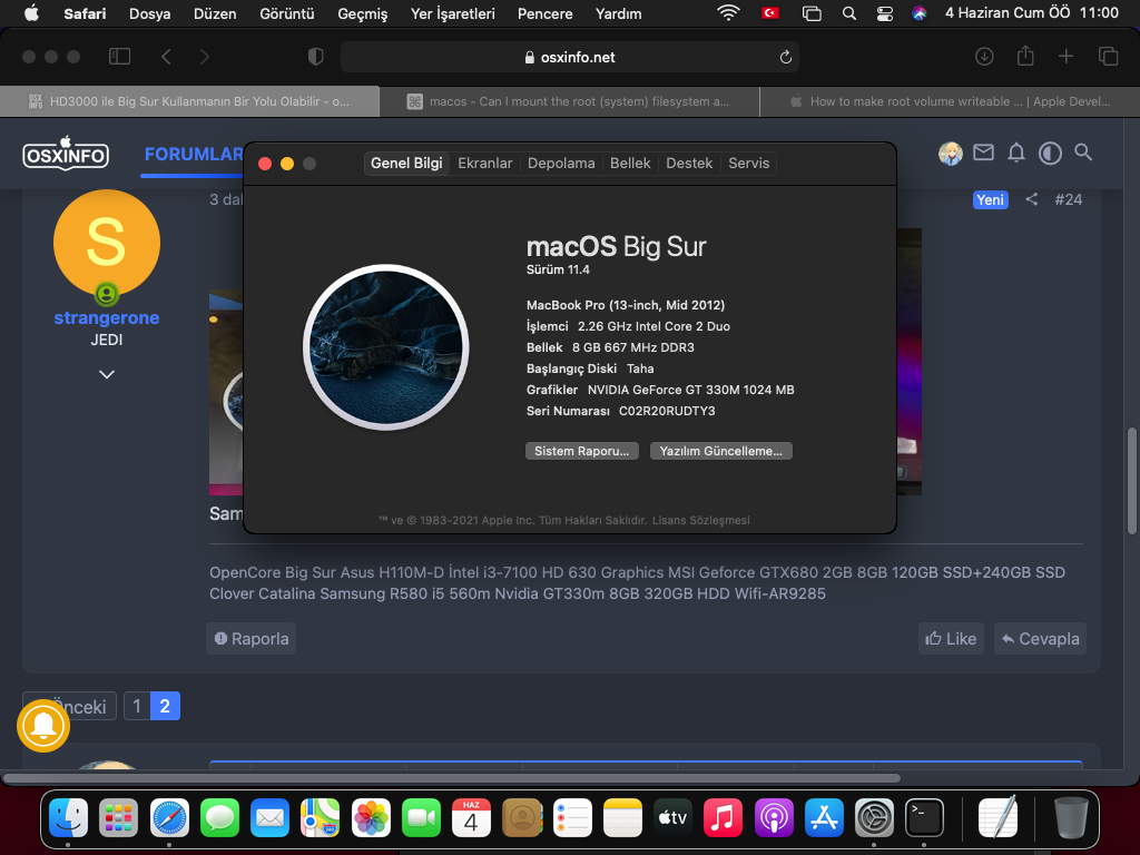 Sorun Samsung i5 560m (1. nesil) R580'e Big Sur kurmak değil biraz uğraşmak gerekiyor ama sonuçta kuruluyor ki kurdum. Sorun uyumsuz ekran kartı Gt330m'in tanıtılması. Teorik olarak Chris1111 yaması ile olabilir mi evet olabilir. Ancak bunun için Big Sur diske yazma izninin alınması gerekiyor diye düşünüyorum ki Ar9285 de S/L/E yüklenmeden olmuyor. Yapılması için gereken komut sistemi forumda var. Ancak Big Sur diski mount ettikten sonraki komutta hata alıyorum. Bakalım deneye deneye çözeceğiz. Neticede Hackintosh sabır işidir.