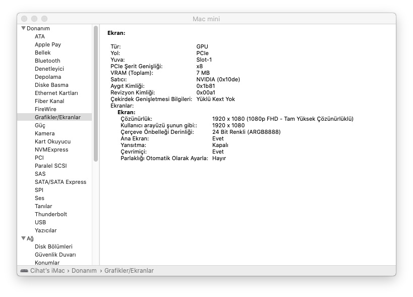 Elma Menüsü->Bu Mac Hakkında->Sistem Raporu->Grafikler/Ekranlar sayfasının da görüntüsünü paylaşırsan sevinirim.
