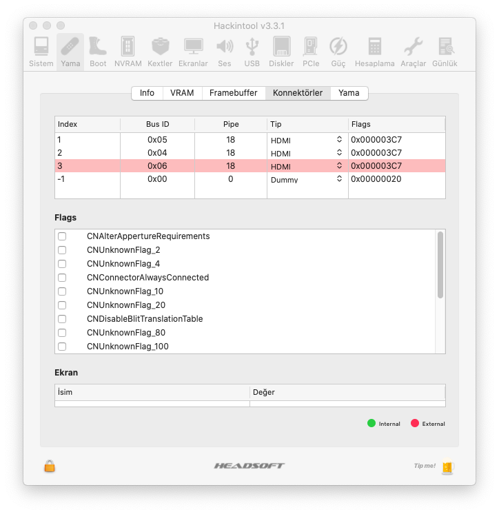 hackintoolda hangi monitörden görüntü aldığım gözükmüyor yeşil yanan bir kısım yok ve BUS ID'leri değiştiremiyorum