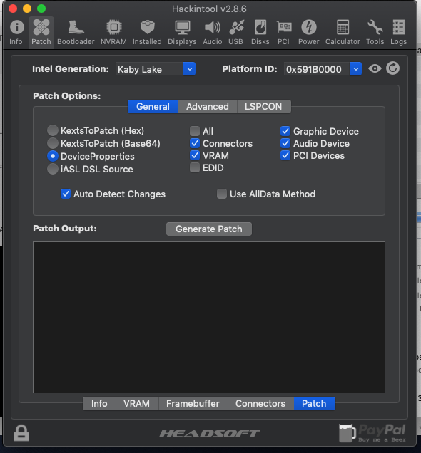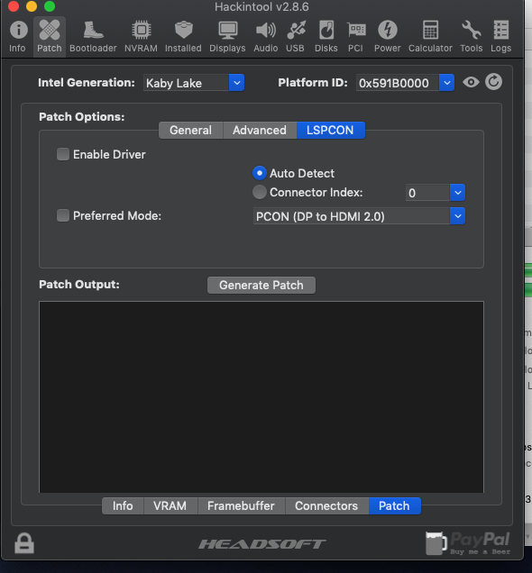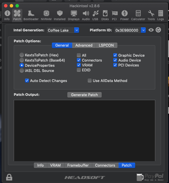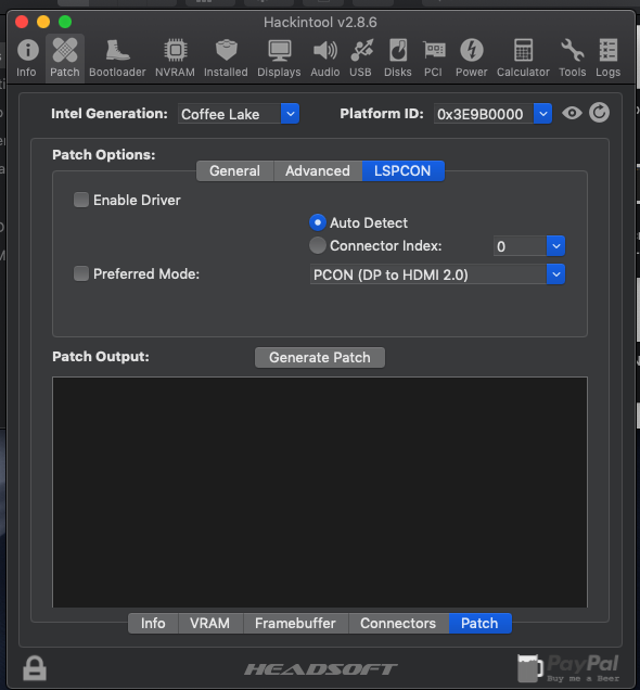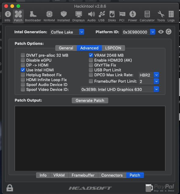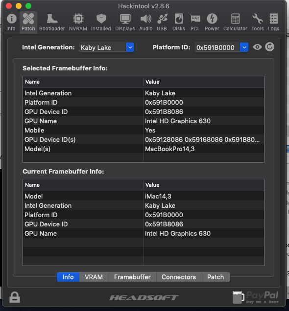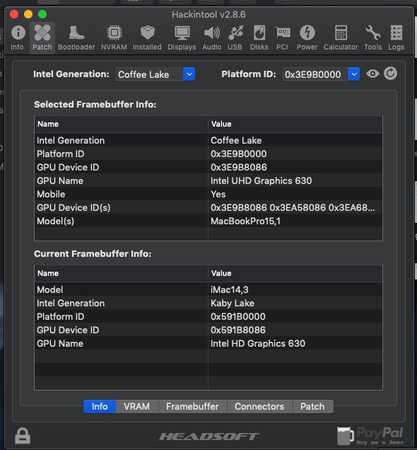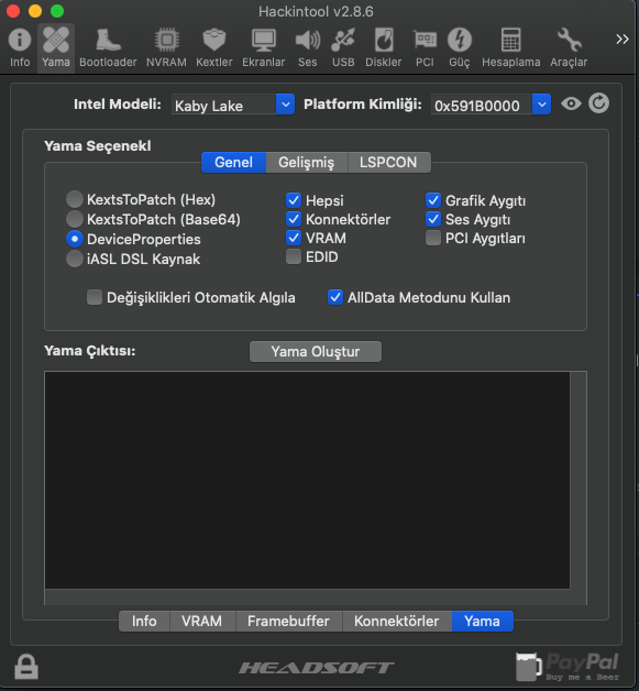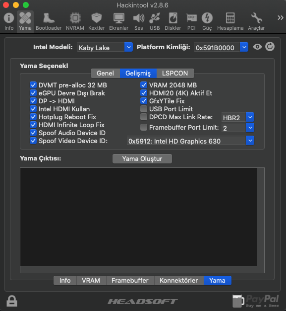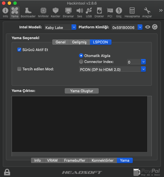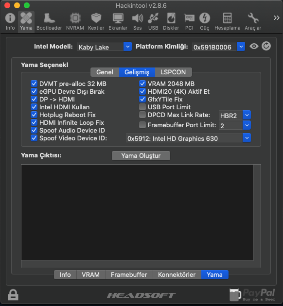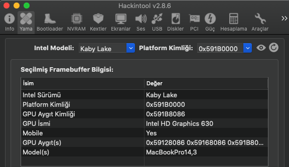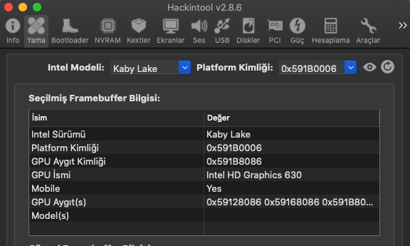 - HackinTool kullanarak Framebuffer patch yapmayı denedim.