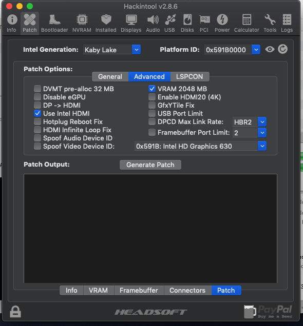 - RehabMan'in HD630 için yayınladığı plist'leri denedim. (Spoof'lu olanları da).