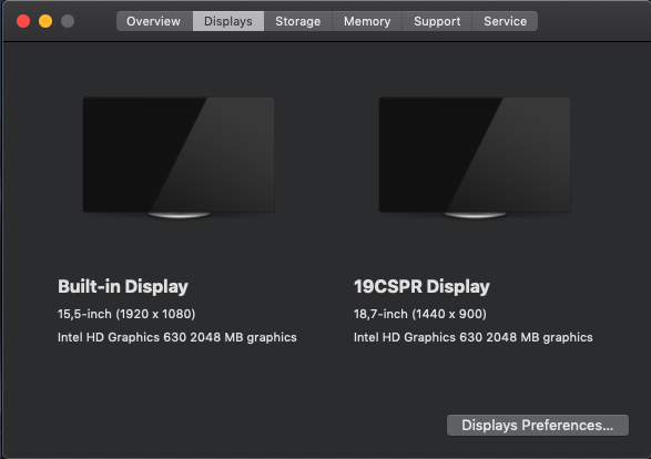 Bilgisayarıma macOS Mojave Version 10.14.1 kurdum. Kurulum sonrası sol üstteki menüden "About This Mac" sayfasına girdiğimde Intel HD Graphics 630 4 MB yazıyordu ve hem laptopun monitörü (15.6" built-in display 1920*1080) hem de harici monitörüm (19" HDMI çıkışlı 1440*900) her ikisi de görüntü veriyordu. Fakat "Displays" kısmında iki monitör bağlı olmasına rağmen sadece 1 tane monitör bağlı gibi gösteriyordu. (Buraya kadar ki bilgilerin görselleri aşağıda)