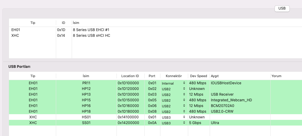 Yukarıda belirttiğim gibi USB haritalandırmamda sorun varmış şöyleki ben eski yapılandırmamı Windows üzerinden yapmıştım USBMapTool uygulaması ile ancak Hack'imde Hackintool ile yaptığım yapılandırma arasında bazı farklılıklar tespit ettim.