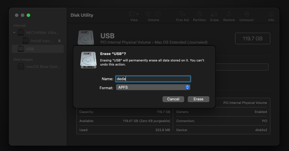 - Bu işlemden sonra artık sistem boot edecektir. Kurulum ekranına ulaştığınızda Disk izlencelerini açın ve diskiniz APFS olarak formatlayın.