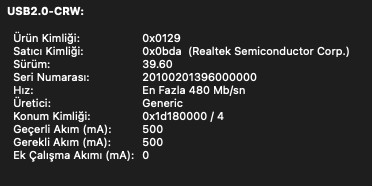 | 51X9 | 0x0BDA0139 | RTS5139 USB 2.0 / 3.0 Kart Okuyucu | Evet | 0.9.5 |