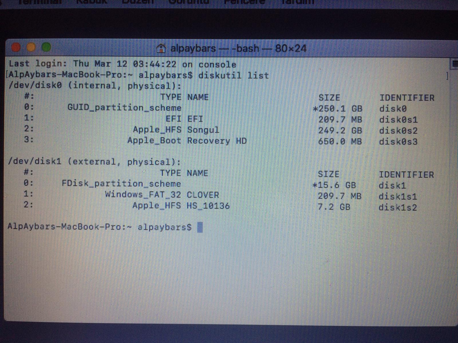 Terminal aç ve diskutil list komutu kullanıp çıkan sonucu paylaş.