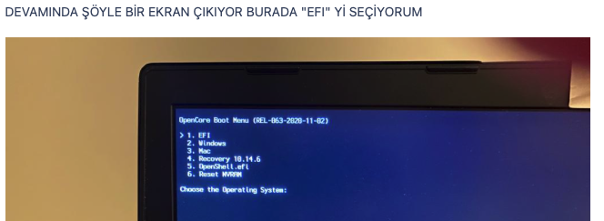 Bu ekranda efi seçmenizin nedeni ne altındaki uyarıda işletim sistemini seç yazılı iken :) OpenCore görevini yapmış sizi başlangıç ekranına taşımış. Bu ekranda (bir iki değişiklikle simgeler imaj olarak görünür) yön tuşlarıyla Mac seçin (Mojave kurulu sanırım) sonra enter. Sistemi açıp açmayacağına bakalım. Sonrasında Clover efi kalıntısını çözeriz.
