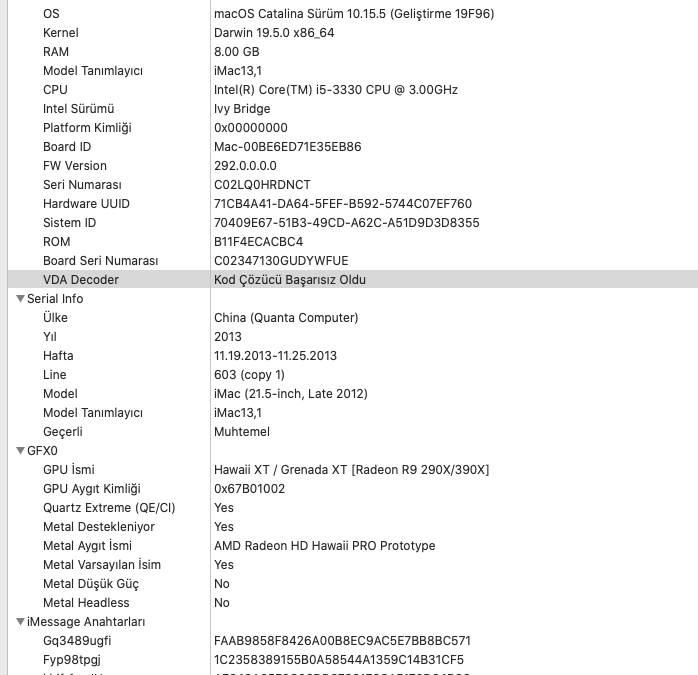 Hackintoolda VDA Decoder : Kod çözücü başarısız oldu olarak gözüküyor. Ekran kartımı fake id tanıttım. Ufak takılmalar oluyor. Bu yüzden olduğunu düşünüyorum. Opencore BL kullanıyorum.